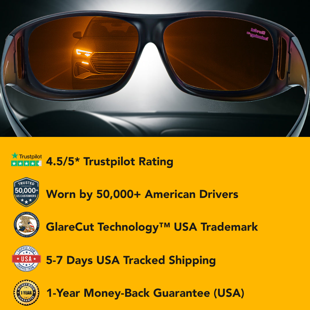 If you don't feel safe driving at night or are not 100% happy for any reason after wearing Headlight Glasses with GlareCut Technology™, please let us know: support@headlightglasses.com